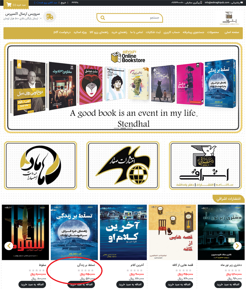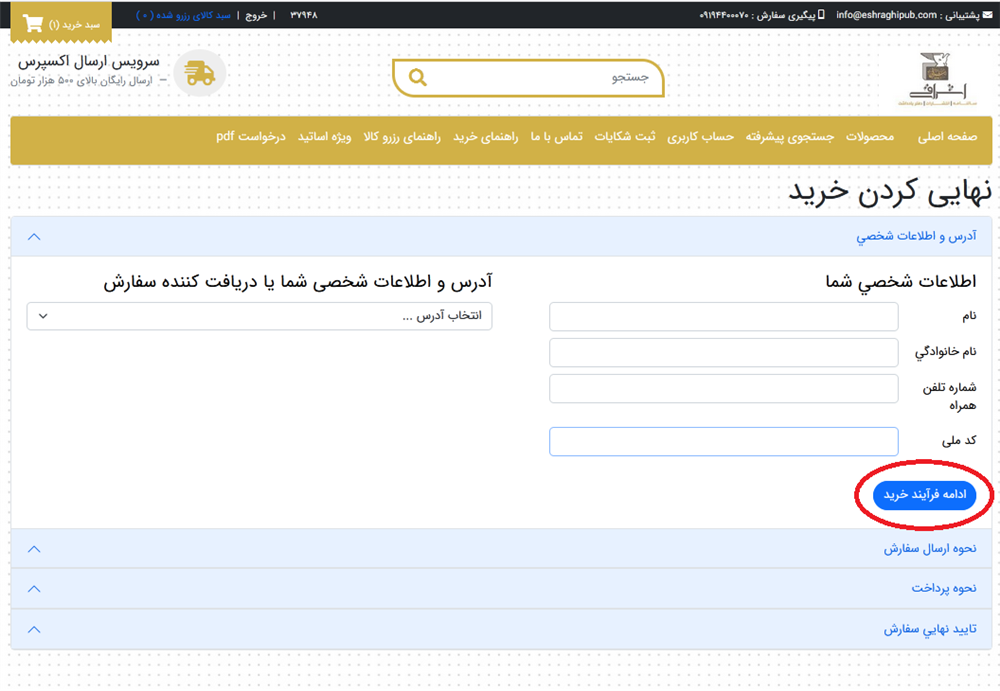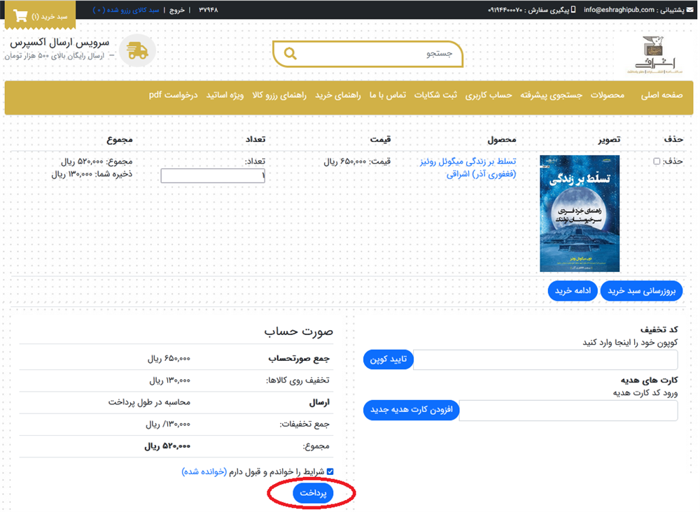 در صورت داشتن كوپن تخفيف و يا كارت هديه مي توانيد آن را اعمال نماييد. اگر قصد اضافه كردن محصول ديگري به سبد خريد را داريد گزينه ادامه خريد را انتخاب كنيد. در صورت حذف كردن كالايي گزينه حذف را تيك بزنيد و بروز رساني را كليك نماييد. بعد از ايجاد تغييرات لازمه و قبول شرايط ومقررات فروشگاه انتشارات اشراقي پرداخت را بزنيد.