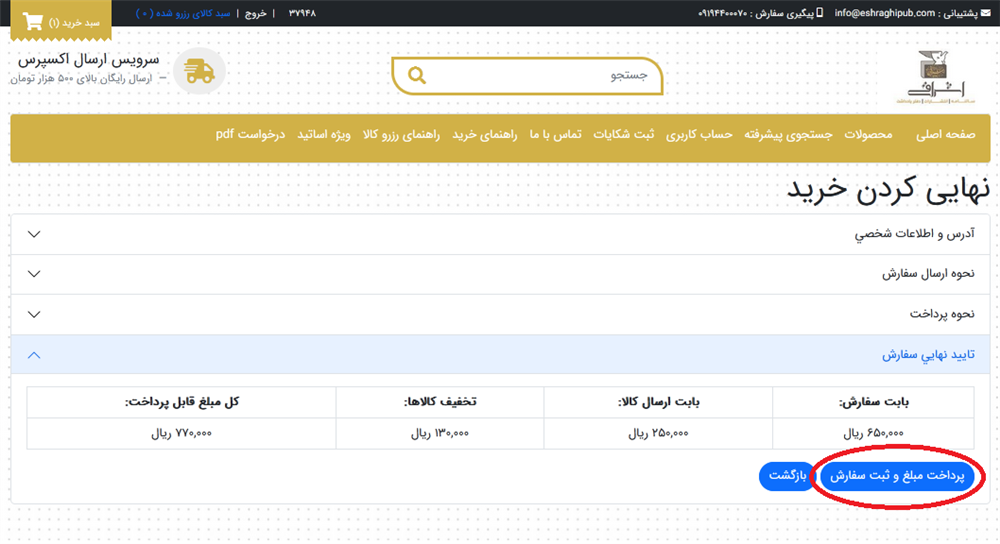 پس از مشاهده فاكتور و جزئيات براي رفتن به مرحله بعد گزينه پرداخت مبلغ و ثبت سفارش را كليك كنيد.