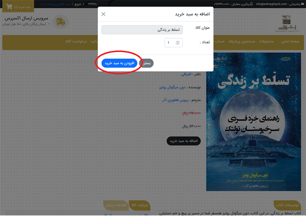 تعداد كالاي مورد نياز خود را وارد نماييد. گزينه افزودن به سبد خريد را انتخاب كنيد. در صورت منصرف شدن از خريد علامت ضربدر يا بستن را بزنيد.
