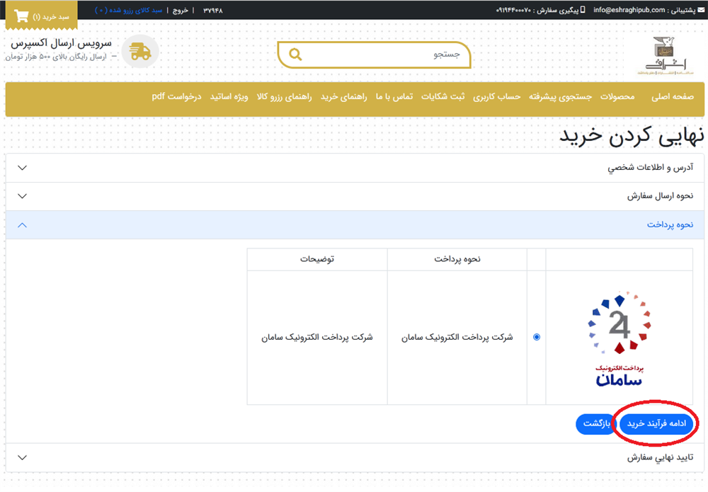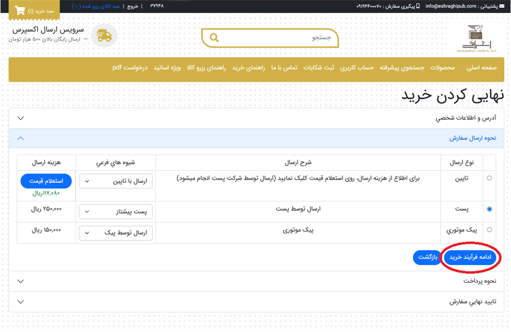 در صورتي كه ارسال توسط پيك يا تاپين را انتخاب نماييد نحوه پرداخت به دو صورت نقدي در محل يا پرداخت الكترونيكي نمايش داده مي شود. ارسال توسط پست نحوه پرداخت آن به صورت پرداخت الكترونيكي مي باشد. گزينه ادامه فرآيند خريد را انتخاب نماييد.