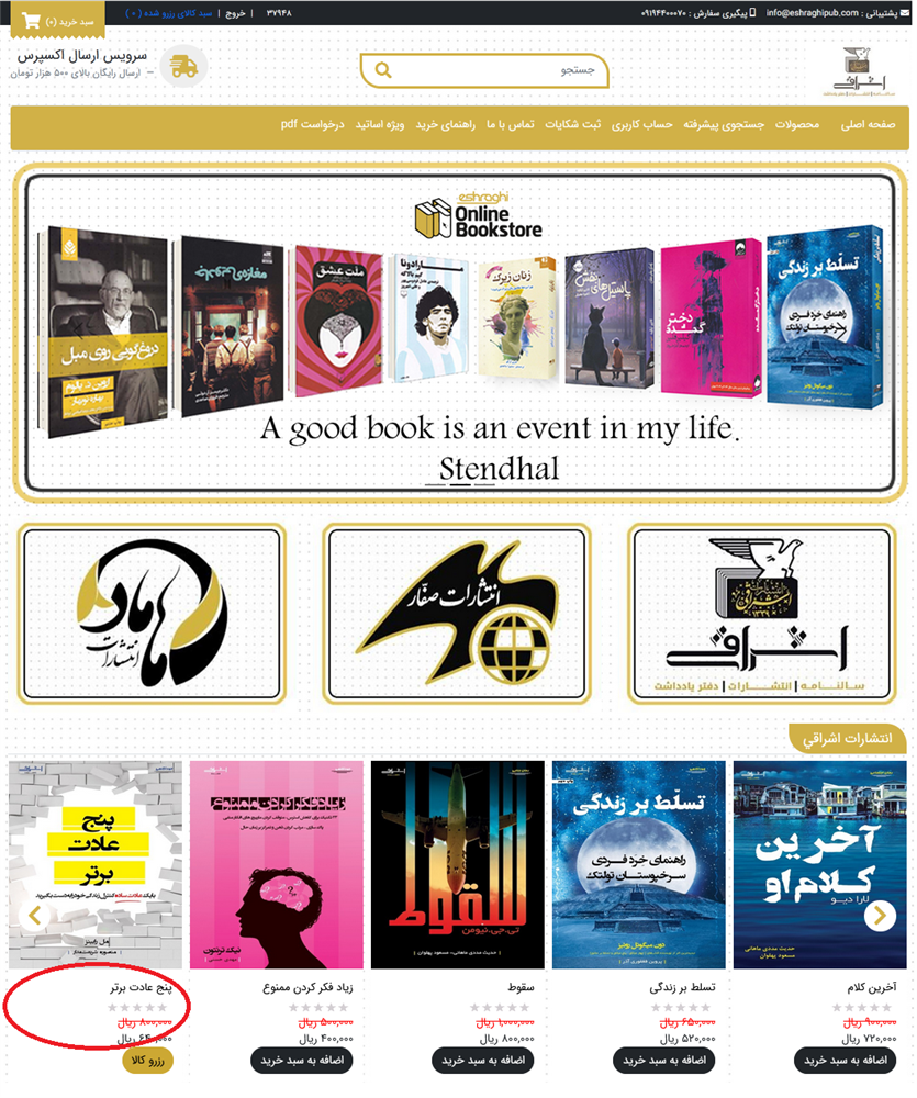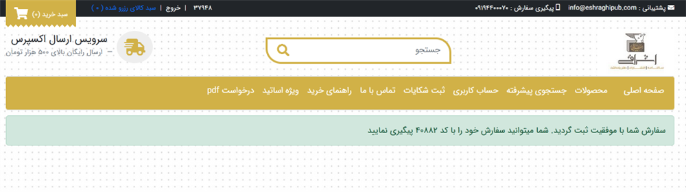 7.به دليل اينكه سفارش شما رزرو كالا مي باشد وارد صفحه پرداخت نمي شود و يك كد پيگيري دريافت مي كنيد اين كد براي پيگيري سفارش شما مي باشد. رزرو كالا بدين معني كه در حال حاضر كتاب درخواستي شما داخل فروشگاه انتشارات اشراقي موجود نمي باشد. پس از رزرو كالا سفارش شما توسط ما پيگيري و در صورت موجود بودن در بازار تهيه و از طريق ايميل، تماس تلفني و يا سامانه پيامكي 30005351 به شما اطلاع داده خواهد شد. سپس سبد خريد شما فعال شده و مي توانيد كتاب مورد نظر خود را با تخفيف خريداري كنيد.