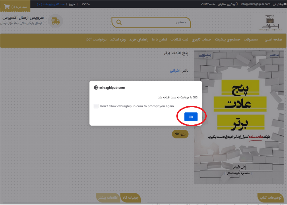 4.پيام (كالا با موفقيت به سبد خريد اضافه شد) نمايش داده مي شود و با انتخاب گزينه قبول (ok) پيام بسته مي شود.