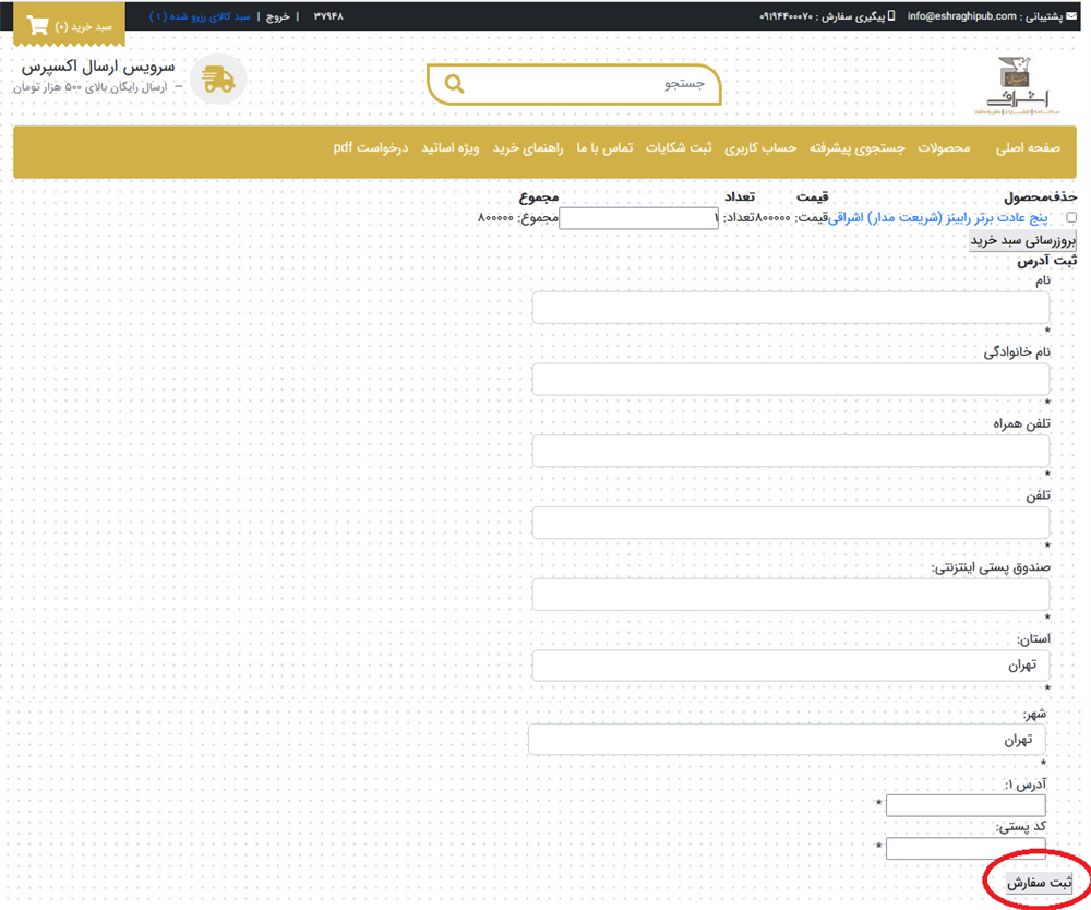 6.اگر قصد حذف كردن كالايي داريد گزينه حذف را تيك بزنيد و بروزرساني را كليك كنيد. آدرس و مشخصات خود را وارد نماييد. لازم به ذكر است مواردي كه ستاره دار هستند پر كردن آن الزامي مي باشد. بعد از تكميل كردن موارد گزينه ثبت سفارش را بزنيد.